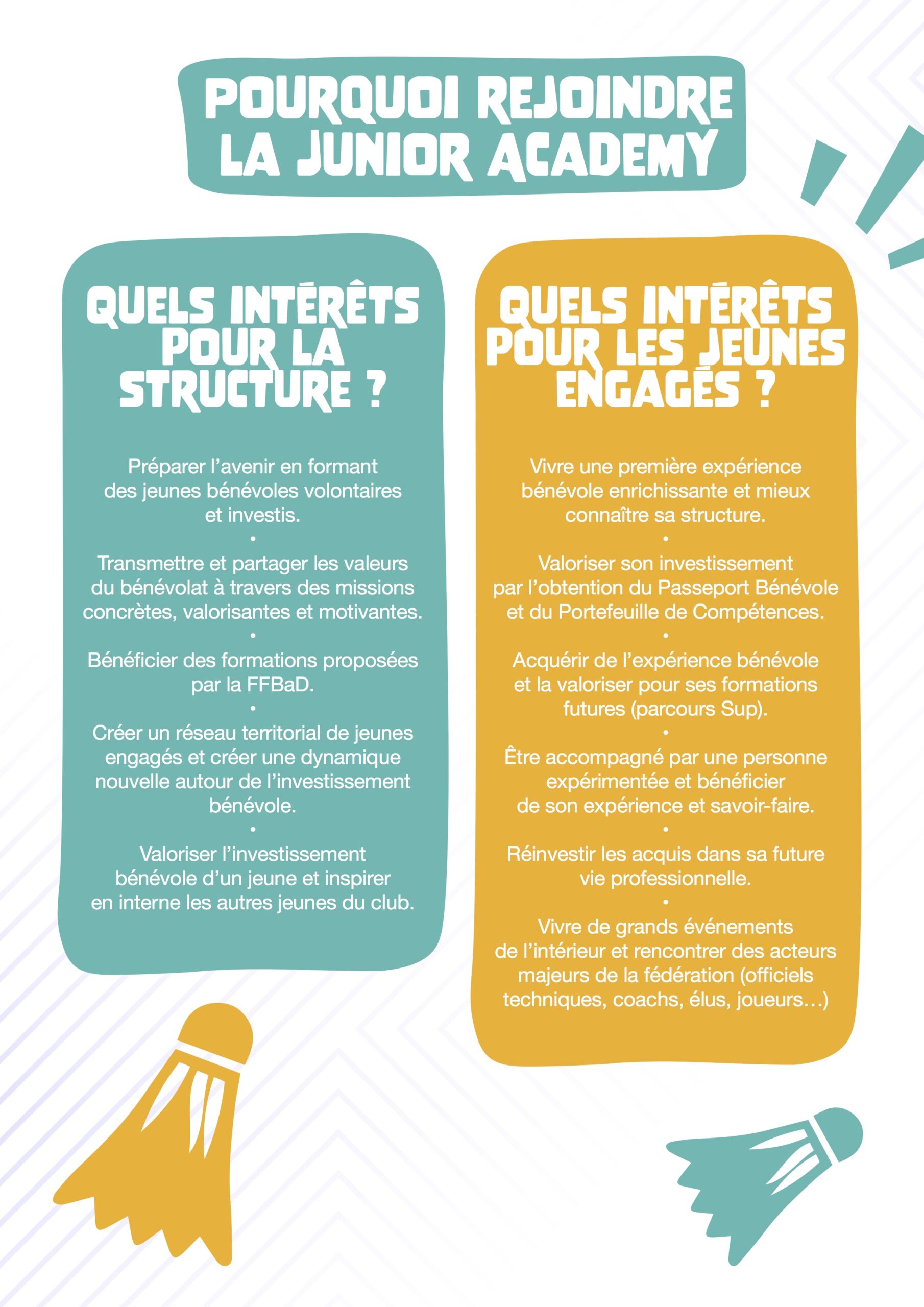 La Junior Academy forme et accompagne les bénévoles de demain (dirigeants, officiels techniques et encadrants) au travers d’une formation accessible aux jeunes licenciés de 13 à 17 ans.